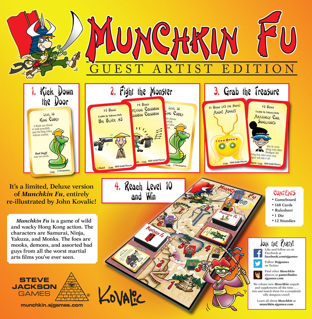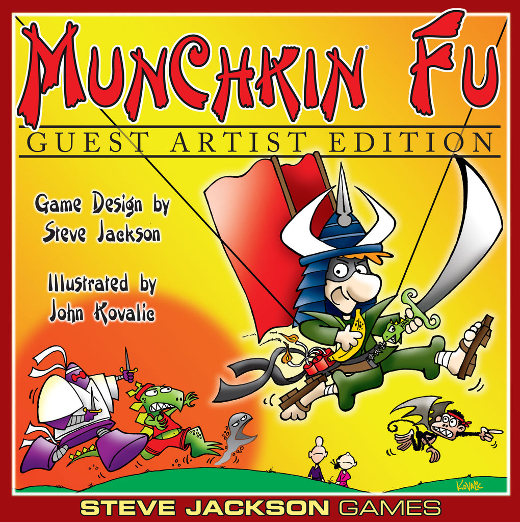 This Guest Artist Edition includes completely re-illustrated game cards, a gameboard featuring John Kovalic's Munchkin art, and male and female standies for each player.