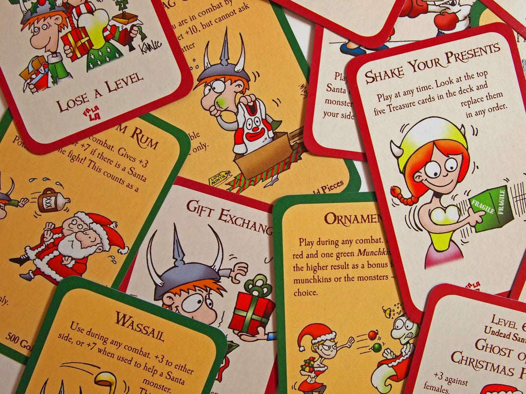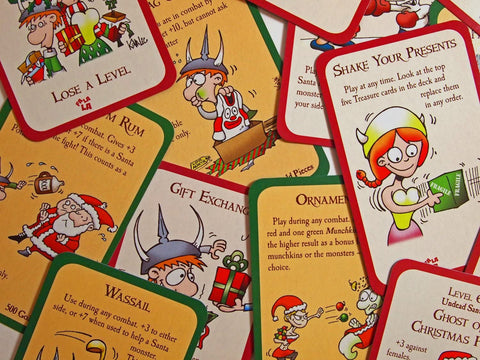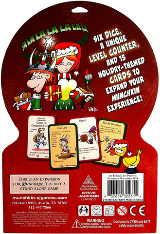 The Holidazed pack combines eleven new cards with four reprints from the hard-to-find Munchkin Holiday Surprise, a candy-themed Level counter, and six red-and-green festive 14mm dice! Not included: gratuitous exclamation points!!!!!