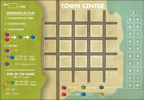 In Town Center, players build a city – in particular, the town center. They add cubes on their personal board and try to arrange them as best as possible in order to score the most victory points. Each cube represents a different type of module. Flats, shops, offices, generators, lifts, car parks, town hall can be built and stacked during the course of the game. Each module generates influence on adjacent land and on cubes directly below or above.
