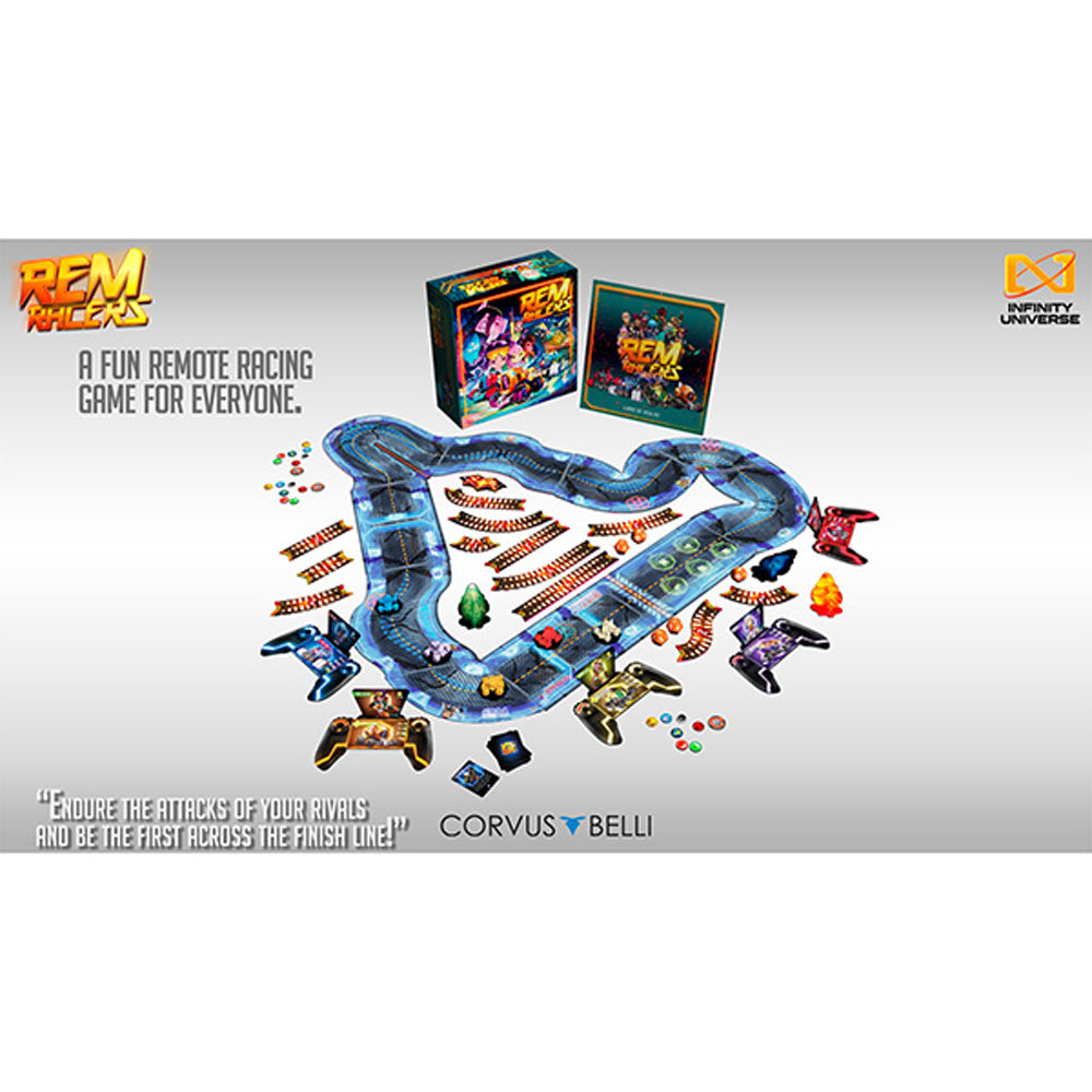 REM Racers is a fun remotes racing game for the whole family, set in Infinity's sci-fi universe. The goal is to win the race by being the first to cross the finish line while survive your rival's attacks. To do so, you will have to drive your remote with movement templates and manage your equipment cards to get your rivals off the track or prevent them from doing the same.