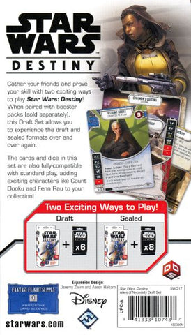 Like Rivals before it, players just need a copy of Allies of Necessity and six Star Wars: Destiny booster packs to participate in their every own draft or sealed event! What's more, the cards in your Allies of Necessity Draft Set are completely reusable—no matter how many drafts you play, you'll only ever need to buy a single copy of Allies of Necessity to enable your draft games of Star Wars: Destiny!