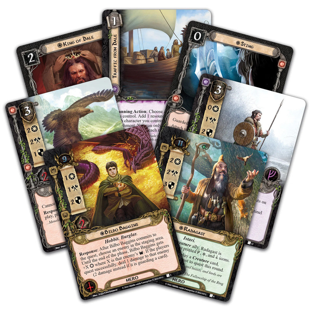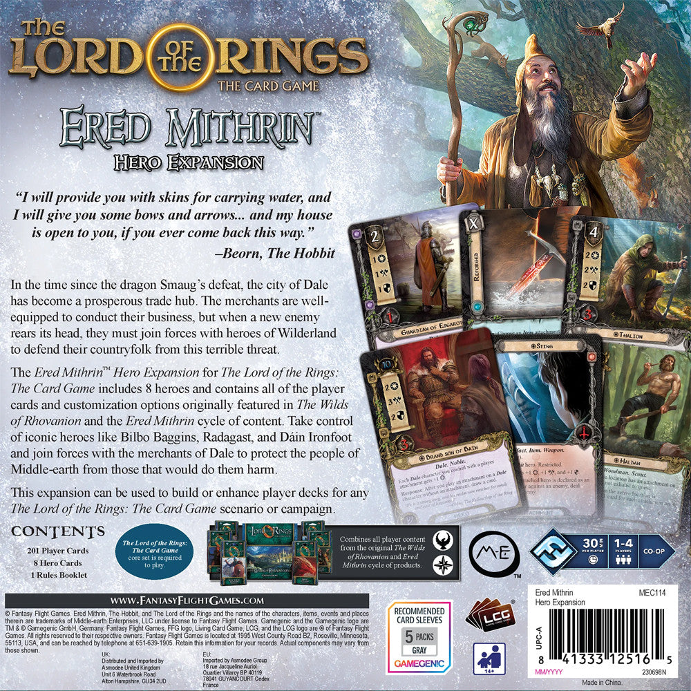 The Ered Mithrin Hero Expansion includes 8 heroes and contains all of the player cards and customization options originally featured in The Wilds of Rhovanion and the Ered Mithrin cycle of content. Take control of iconic heroes like Bilbo Baggins, Radagast, and Dáin Ironfoot and join forces with the merchants of Dale to protect the people of Middle-earth from those that would do them harm.
