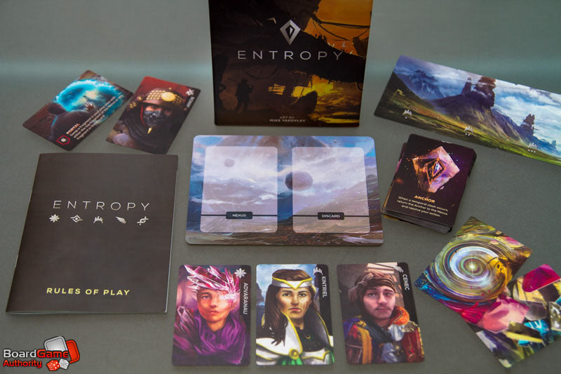 Parallel words collide in Entropy, a card game of risk and deception. The setting for Entropy is fairly deep, and a little dark. As the world around you crumbles into oblivion, somehow you escaped into the Nexus. But does that mean you’ll live? And what of the others that have also managed to temporarily escape certain destruction? Can you find all of the fragments of your world and save the universe before space-time collapses?