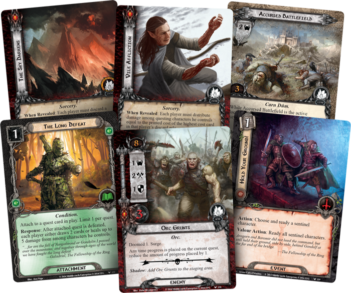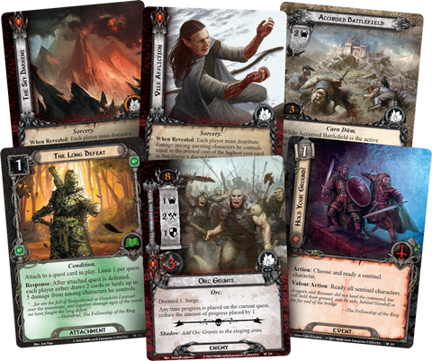 Over the course of the Angmar Awakened cycle, the heroes of Middle-earth have become aware of an evil that threatens the North. Now, the time has come to strike. With its sixty new cards, The Battle of Carn Dum introduces a challenging, combat-intensive scenario that takes your heroes into the heart of Angmar where you'll need to fight your way through hordes of Orcs and other creatures in order to prevent an ancient evil from returning to the world. However, if the walls of Carn Dum and the raw might of the assembled Orcs and Werewolves aren't enough to slow you, you'll still need to deal with the dread Captain that leads them and the foul and shadowed Sorcery that fills the air.