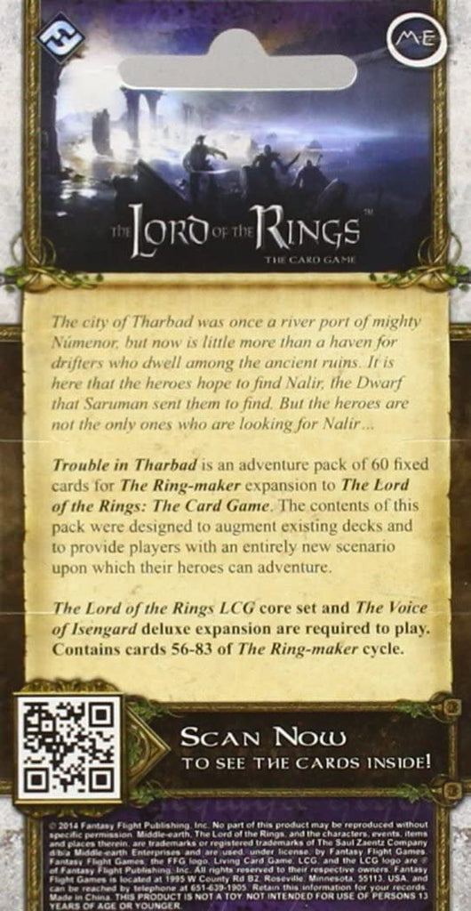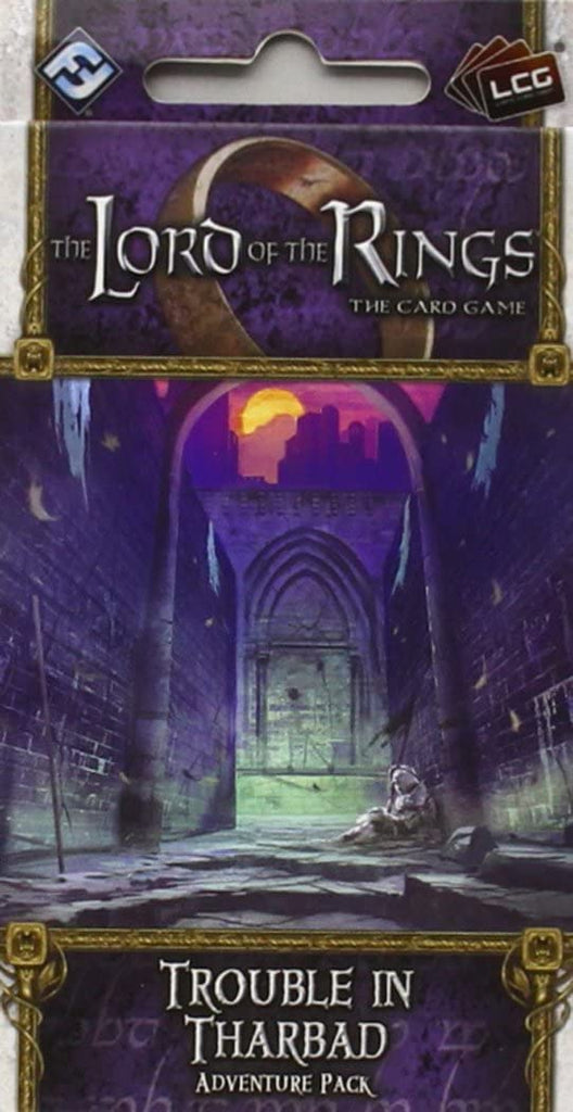 Trouble in Tharbad is an adventure pack of 60 fixed cards for The Ring-maker cycle. The contents of this pack were designed to augment existing decks and to provide players with an entirely new scenario upon which their heroes can adventure.