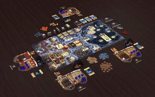 Merchants of the Dark Road uses a rondel-style action system that requires planning several steps ahead. Travel around in your wagon to buy and sell items, recruit heroes, and deliver your wares to the outlying cities of Lumi. Brave the dark roads and join your opponent’s caravans with careful timing to become the richest and most prestigious merchant.