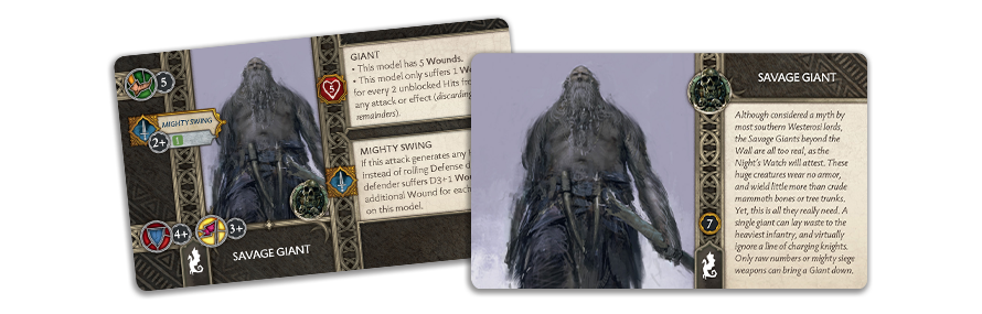 Allied with the Free Folk, Giants are walking siege engines, capable of rending even the most heavily armored men limb from limb, and ignoring all but the mightiest blows. A single Giant in a Free Folk force can stand against unit after unit, crushing, maiming, and smashing anyone or anything foolish enough to bar its way.