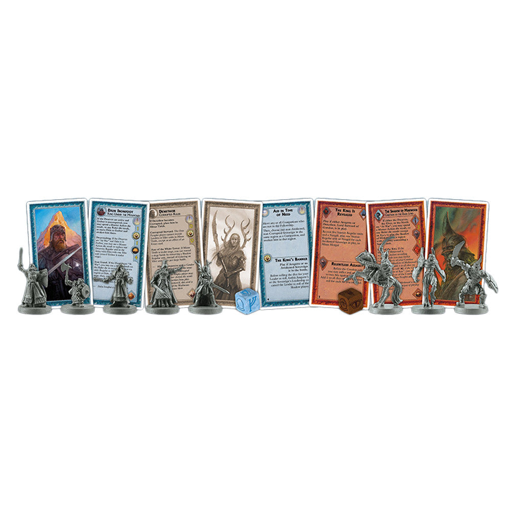 The Sovereigns of the Free Peoples were targeted by Sauron's attempts to bend the will of the peoples opposing him - using the palantíri (the seeing stones), through emissaries, like Gríma, and possibly with other subtle and deceitful means. At the same time, it was crucial for the morale of the Free Peoples to rally around these charismatic figures - Brand, Dáin Ironfoot, Denethor, Theéoden, and Thranduil - to fight against the Shadow. The new rules, miniatures, cards, and Action dice included in this expansion will allow the players to fully develop this conflict and represent the role of these characters in your game.