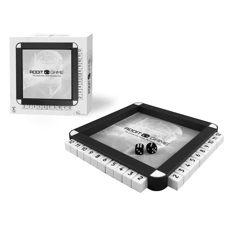 The game that makes number fun. The object of the game is to close all the numbers on your side of the board. This is done by rolling the dice, either add the dice up and push that number through or push through each number on the dice you have rolled. There are many different ways to play this great adding game. Includes game board, dice and rules.