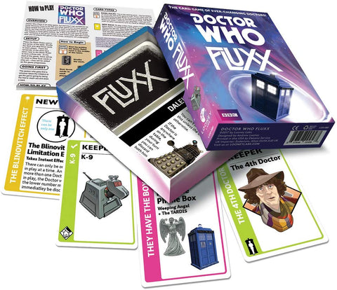 Doctor Who Fluxx takes Fluxx through Time And Relative Dimension In Space. Join with various regenerations of the Doctor, some companions, Gallifreyan tech, and K-9 (but beware of Cybermen, Daleks, Weeping Angels, and the Master) and play the most ever-changingest, timey-wimey version of Fluxx ever created. Doctor Who Fluxx: you'll play it time after time after time after time....