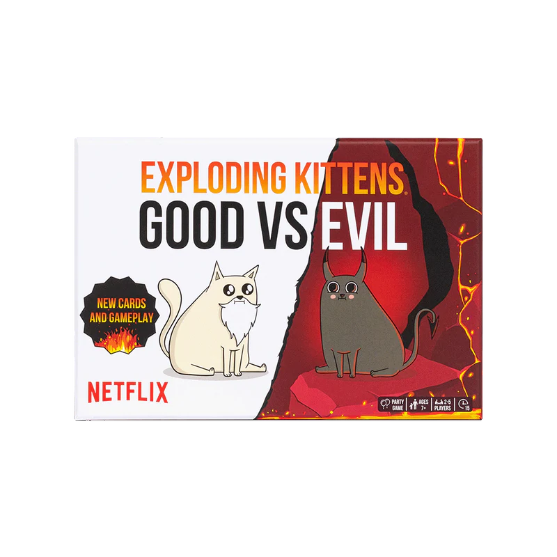 Exploding Kittens: Good vs Evil features brand-new artwork and characters from our first-ever Netflix series. This high-stakes game of kitty-powered Russian Roulette lets you outsmart your friends, raise heck, and stage your own epic battles…all while trying not to explode! Plus we’ve added Armageddon Cards that launch an exclusive mini-game where you duke it out for possession of the most powerful card we’ve ever created.