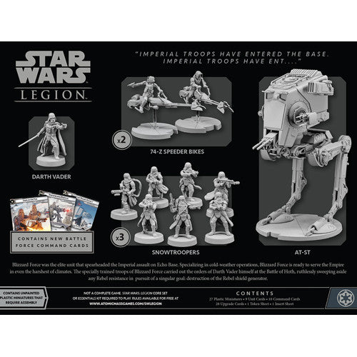 Carrying out the orders of Darth Vader himself, the renowned Blizzard Force crushed the Rebel resistance on Hoth and this Battle Force puts everything players need to construct and play their own Galactic Empire armies at their fingertips, including the commander version of Darth Vader from the Star Wars: Legion Core Set, three units of Imperial Snowtroopers, an AT-ST, a unit of 74-Z Speeder Bikes, and a new Stormtrooper Heavy Response Unit.