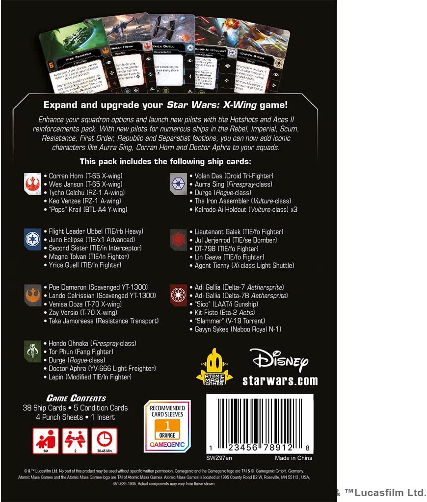 • HOT SHOTS AND ACES: New pilots launch into X-Wing in this new pack! This reinforcement pack gives players even more options for their squadrons of every faction with 35 new ship cards for a wide variety of ships.