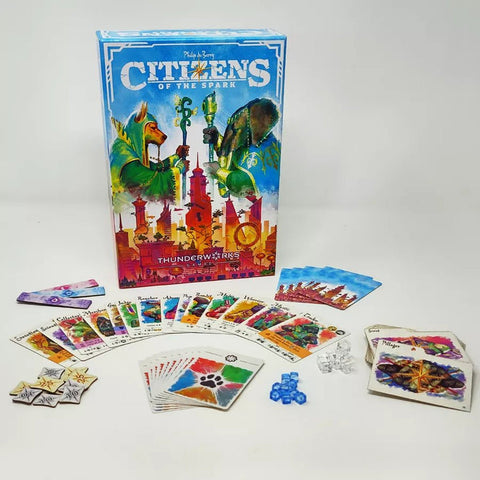 Citizens of the Spark is a variable set-up card game in which players take turns attracting citizens, taking actions, and claiming sparks. The more citizen cards a player has of a specific type, the more powerful that citizen's action becomes. The player with the most sparks in their city when the deck runs out wins!
