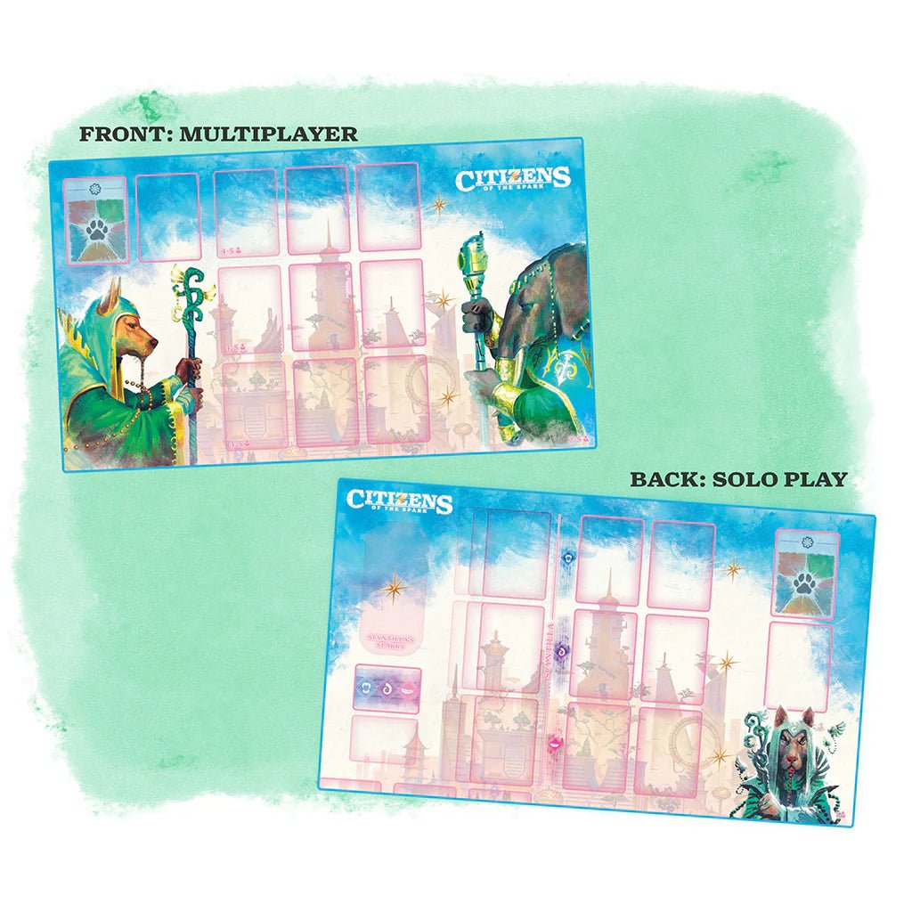 Play Citizens of the Spark in style with this double-sided, stitched playmat. On one side, the playmat organizes where to place cards for multiplayer games. On the other side, the playmat makes it easier to play the game solo.