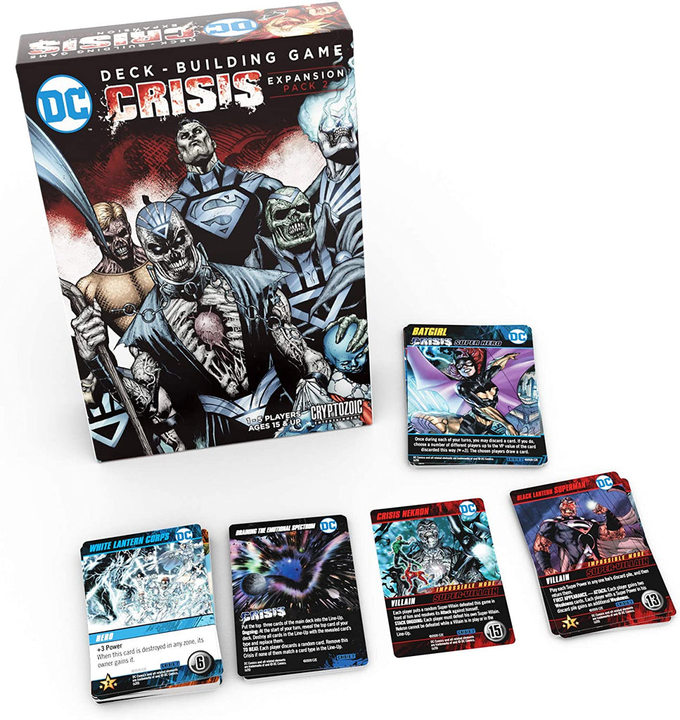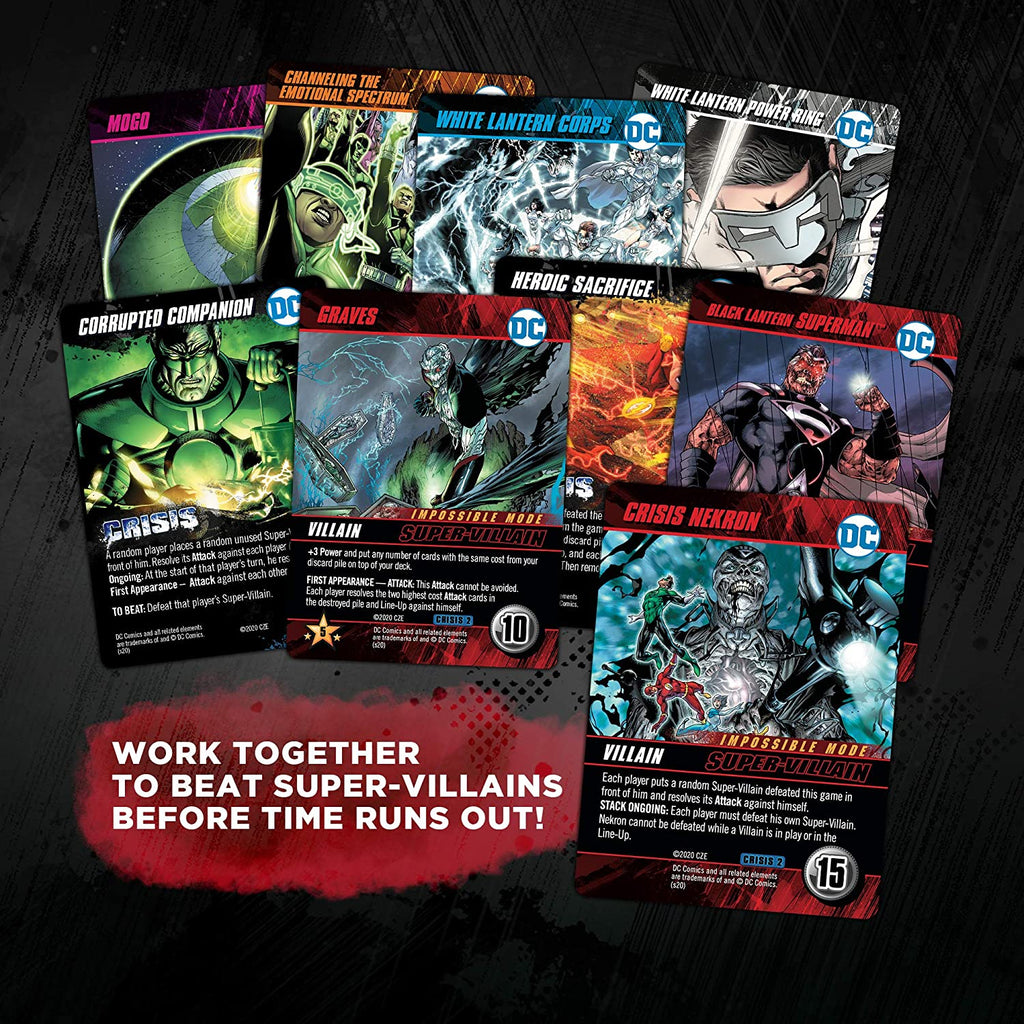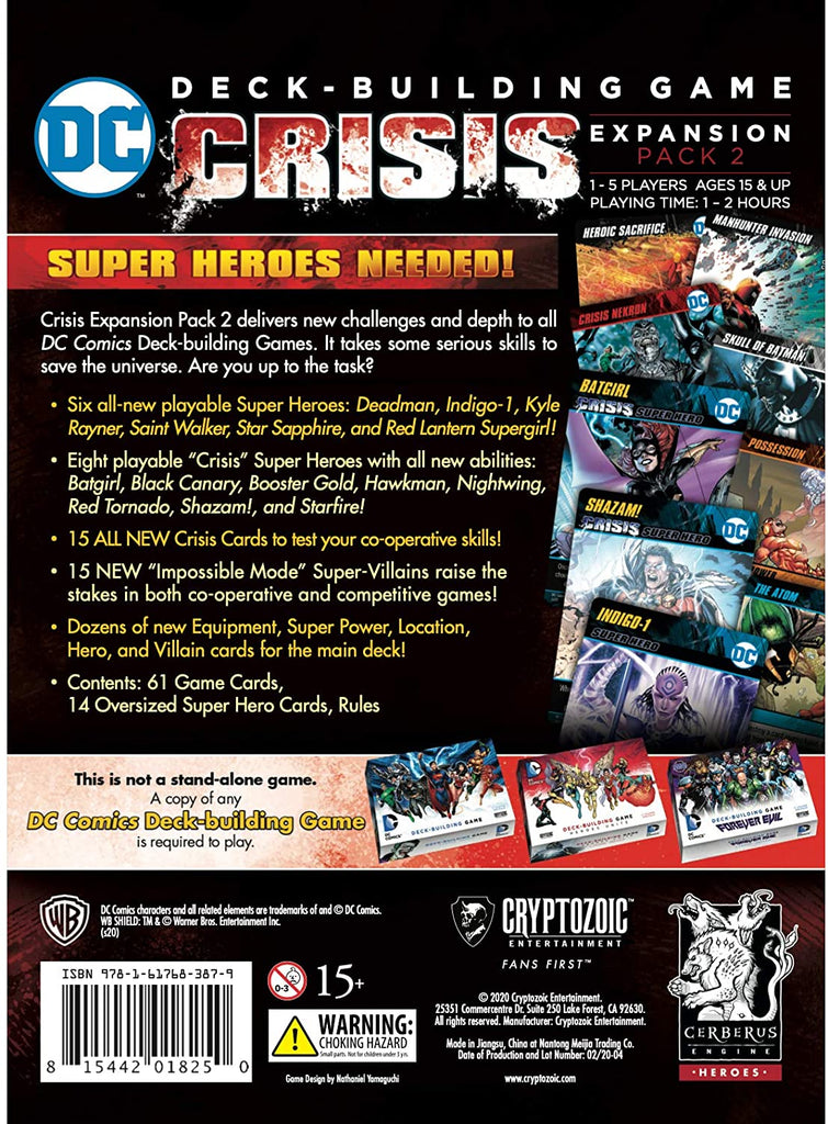 The DC Universe is in peril… again! In the DC Deck-Building Game Crisis Expansion Pack 2, you will face some of the most epic challenges, events, and destructive forces in the history of comic-dom. As a Crisis Expansion you can expect co-operative gameplay and “Impossible Mode” Super-Villains for fans of the popular and critically acclaimed deck-building game. But you’ll also find new Super Heroes and new main deck cards for competitive players. Truly something for everyone!