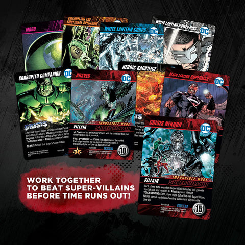 The Crisis cards are for co-operative play only. Players must team-up to overcome these challenging events. The gameplay you thought you knew will never be the same when these ongoing terrors hit the table. Work together to defeat all of the Super-Villains before time runs out!